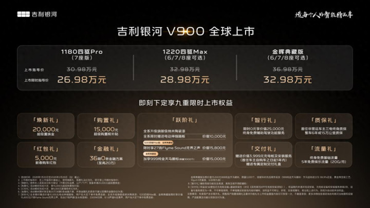 1月20日,吉利银河豪华V系列首发之作,“AI全场景家庭旗舰MPV”——吉利银河V900正式上市,共推出3个车型,上市限时指导价26.98万元-32.98万元。