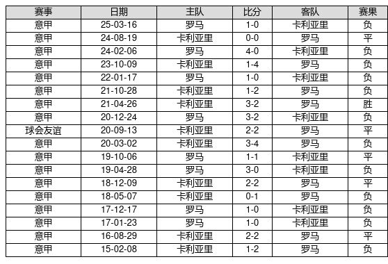 卡利亚里 VS 罗马两队近10年的交战次数为18场,卡利亚里1胜5平12负,赢球概率为5.6%,平局概率为27.8%,输球概率为66.7%。