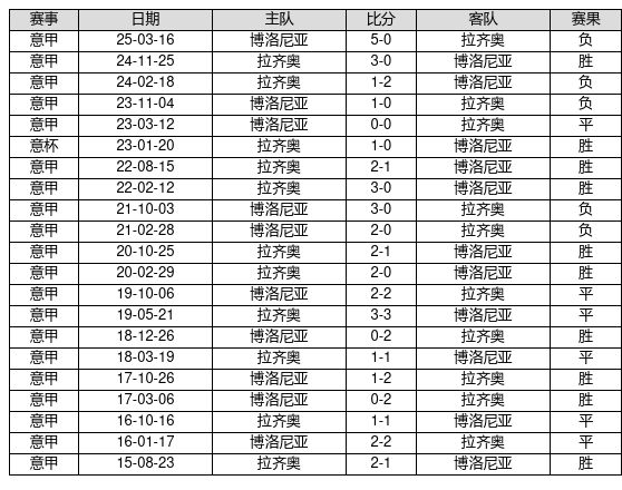 拉齐奥 VS 博洛尼亚两队近10年的交战次数为21场,拉齐奥10胜6平5负,赢球概率为47.6%,平局概率为28.6%,输球概率为23.8%。