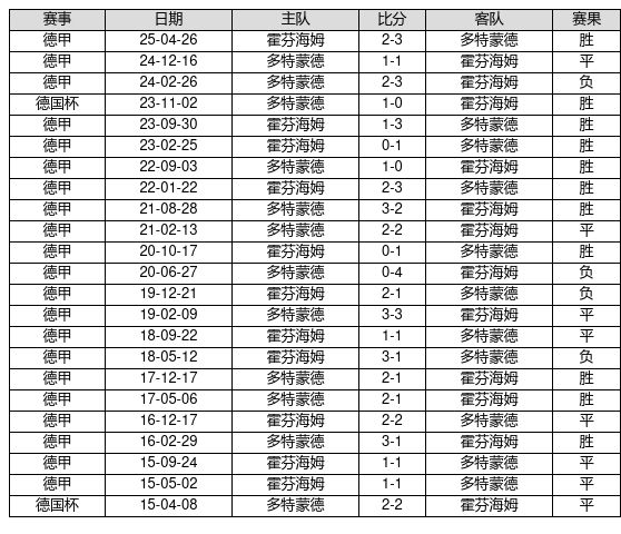 多特蒙德 VS 霍芬海姆两队近10年的交战次数为23场,多特蒙德11胜8平4负,赢球概率为47.8%,平局概率为34.8%,输球概率为17.4%。