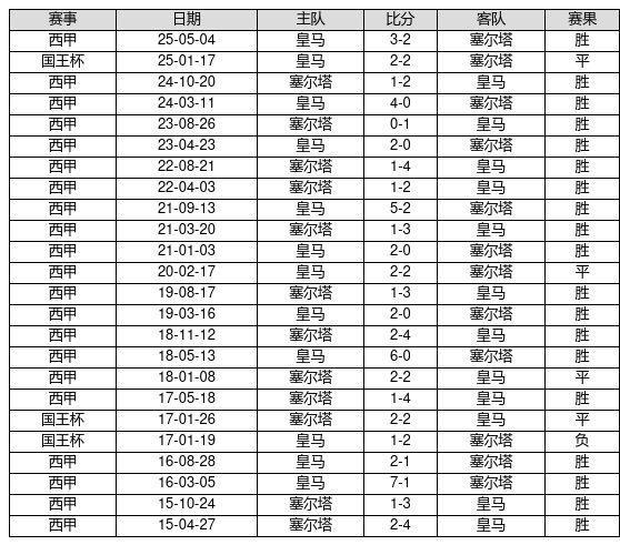 皇马 VS 塞尔塔两队近10年的交战次数为24场,皇马19胜4平1负,赢球概率为79.2%,平局概率为16.7%,输球概率为4.2%。