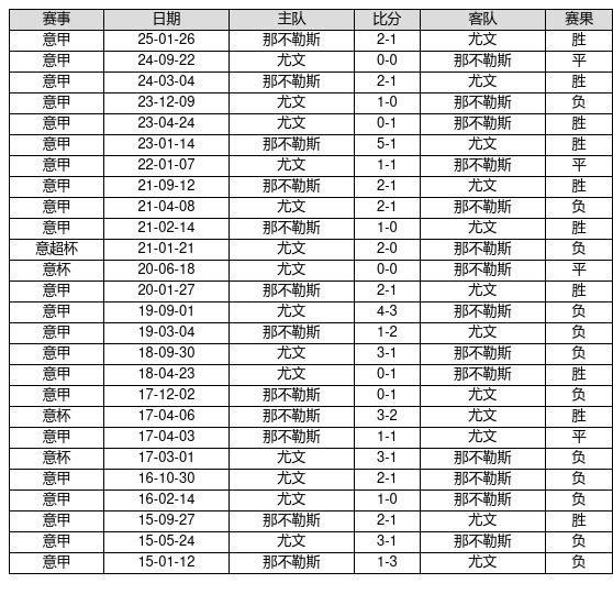 那不勒斯 VS 尤文两队近10年的交战次数为26场,那不勒斯10胜4平12负,赢球概率为38.5%,平局概率为15.4%,输球概率为46.2%。
