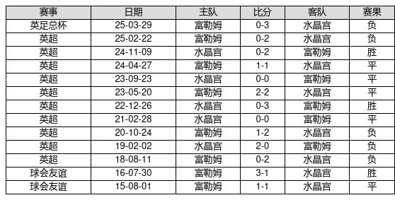 富勒姆 VS 水晶宫两队近10年的交战次数为13场,富勒姆3胜5平5负,赢球概率为23.1%,平局概率为38.5%,输球概率为38.5%。