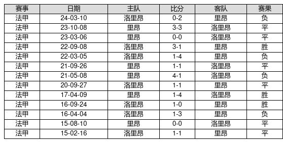 洛里昂 VS 里昂两队近10年的交战次数为13场,洛里昂3胜6平4负,赢球概率为23.1%,平局概率为46.2%,输球概率为30.8%。