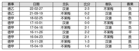 汉堡 VS 不莱梅两队近10年的交战次数为9场,汉堡3胜2平4负,赢球概率为33.3%,平局概率为22.2%,输球概率为44.4%。