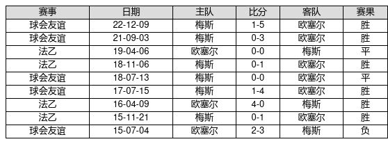 欧塞尔 VS 梅斯两队近10年的交战次数为9场,欧塞尔6胜2平1负,赢球概率为66.7%,平局概率为22.2%,输球概率为11.1%。