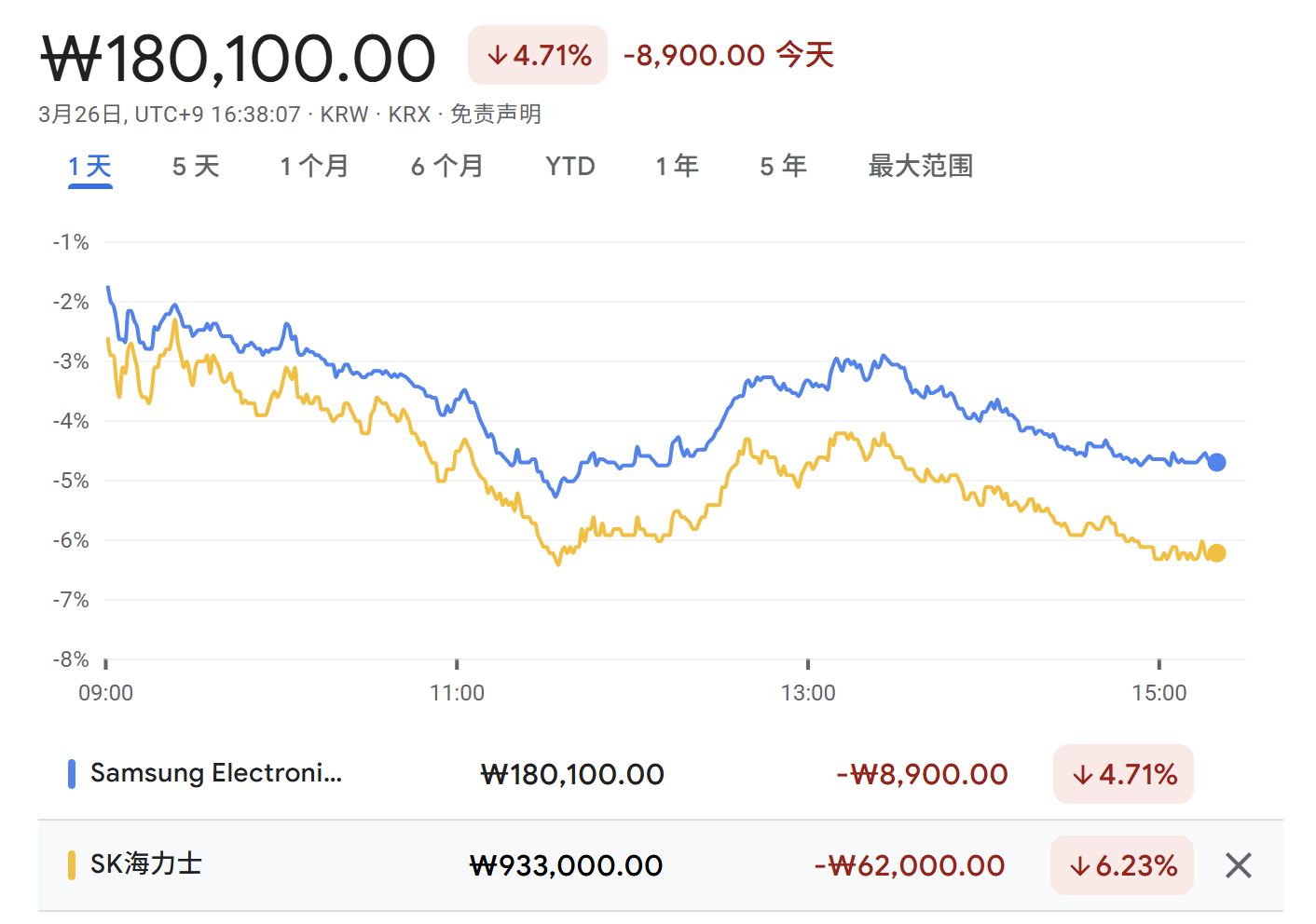 负面情绪迅速扩散至亚洲市场。3月26日,韩国SK海力士股价下跌6.23%,市值损失44.18万亿韩元(约合293.8亿美元);三星电子也下跌了4.71%,市值损失57.83万亿韩元(约合384.5亿美元)。